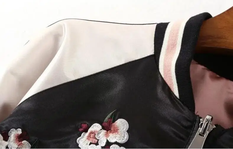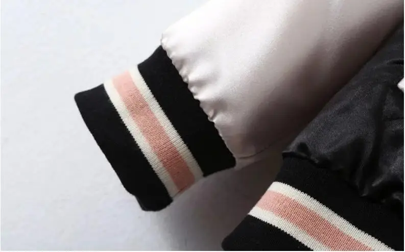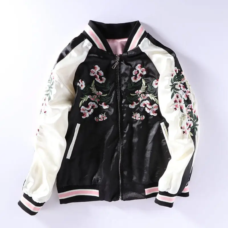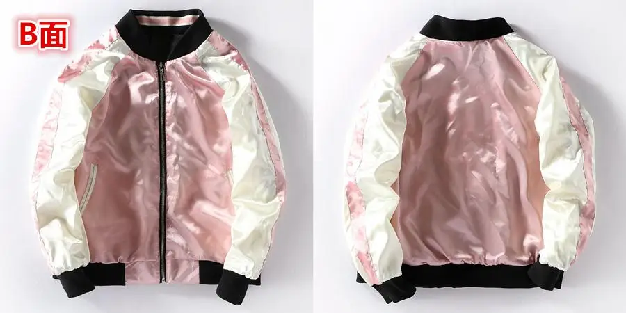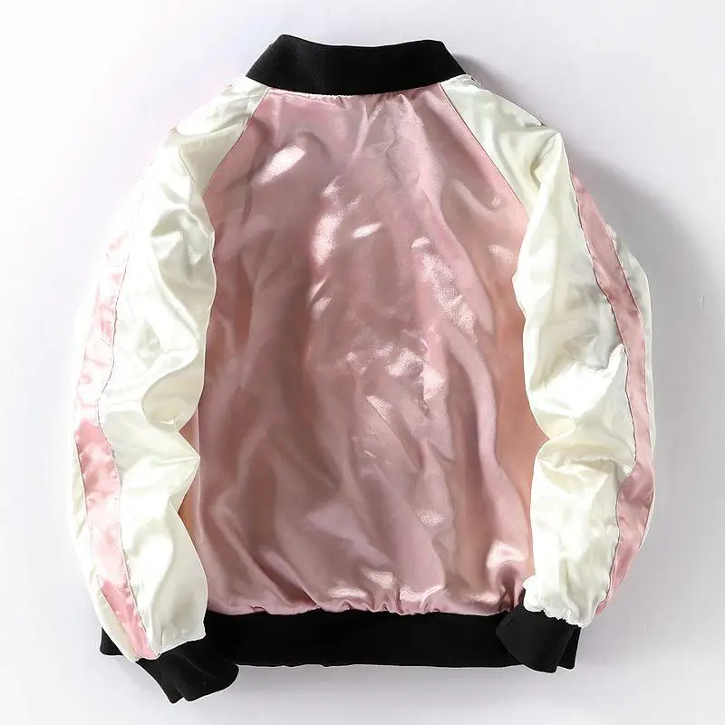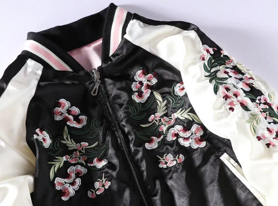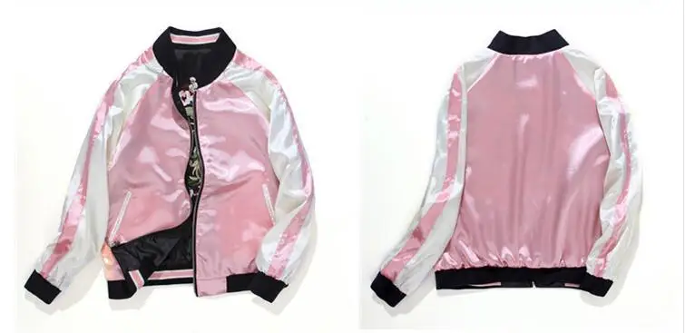 Double side face wear pink sakura embroidery satin cardigan coat tops women autumn winter street casual baseball jackets clothes
