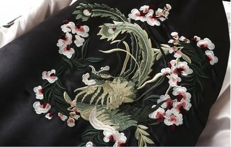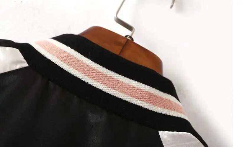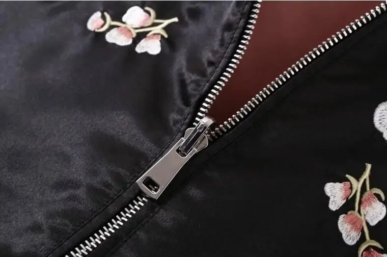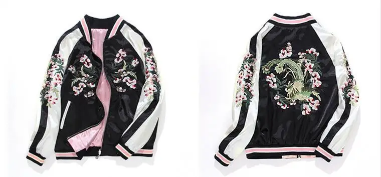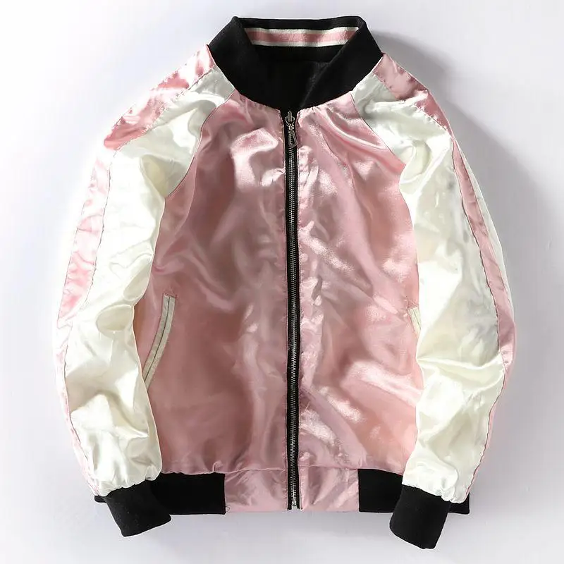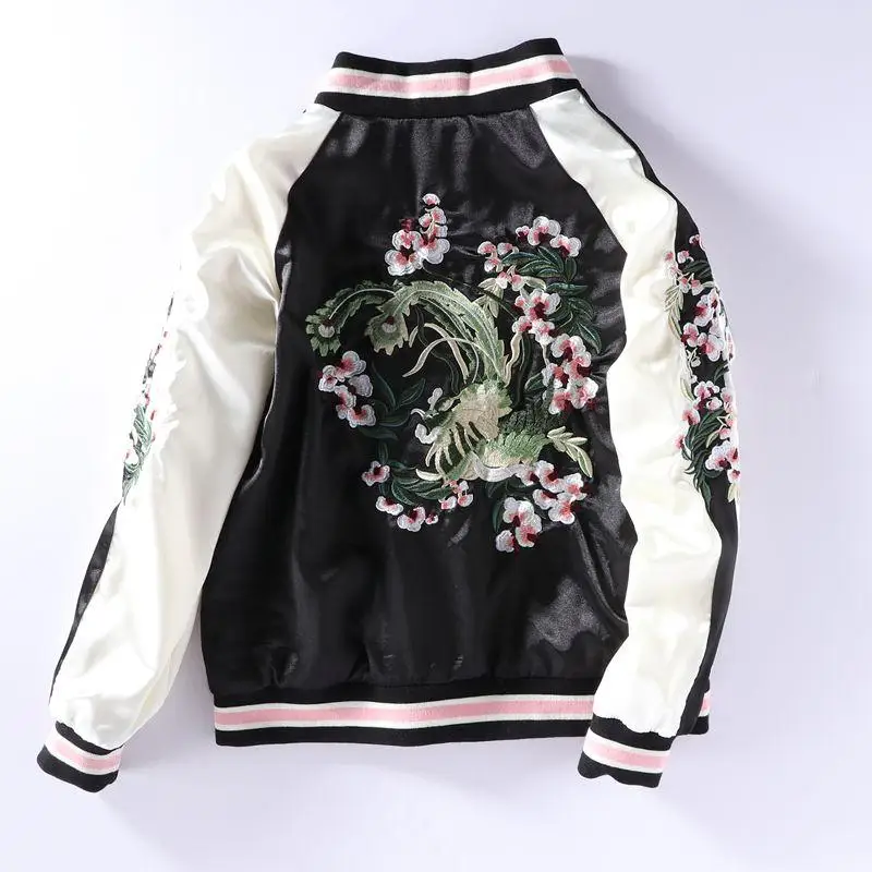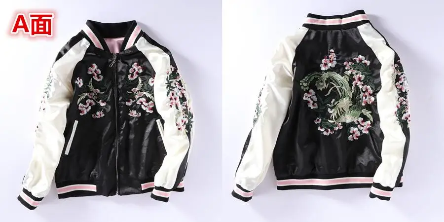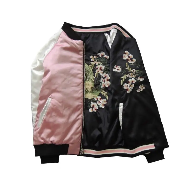 Double side face wear pink sakura embroidery satin cardigan coat tops women autumn winter street casual baseball jackets clothes